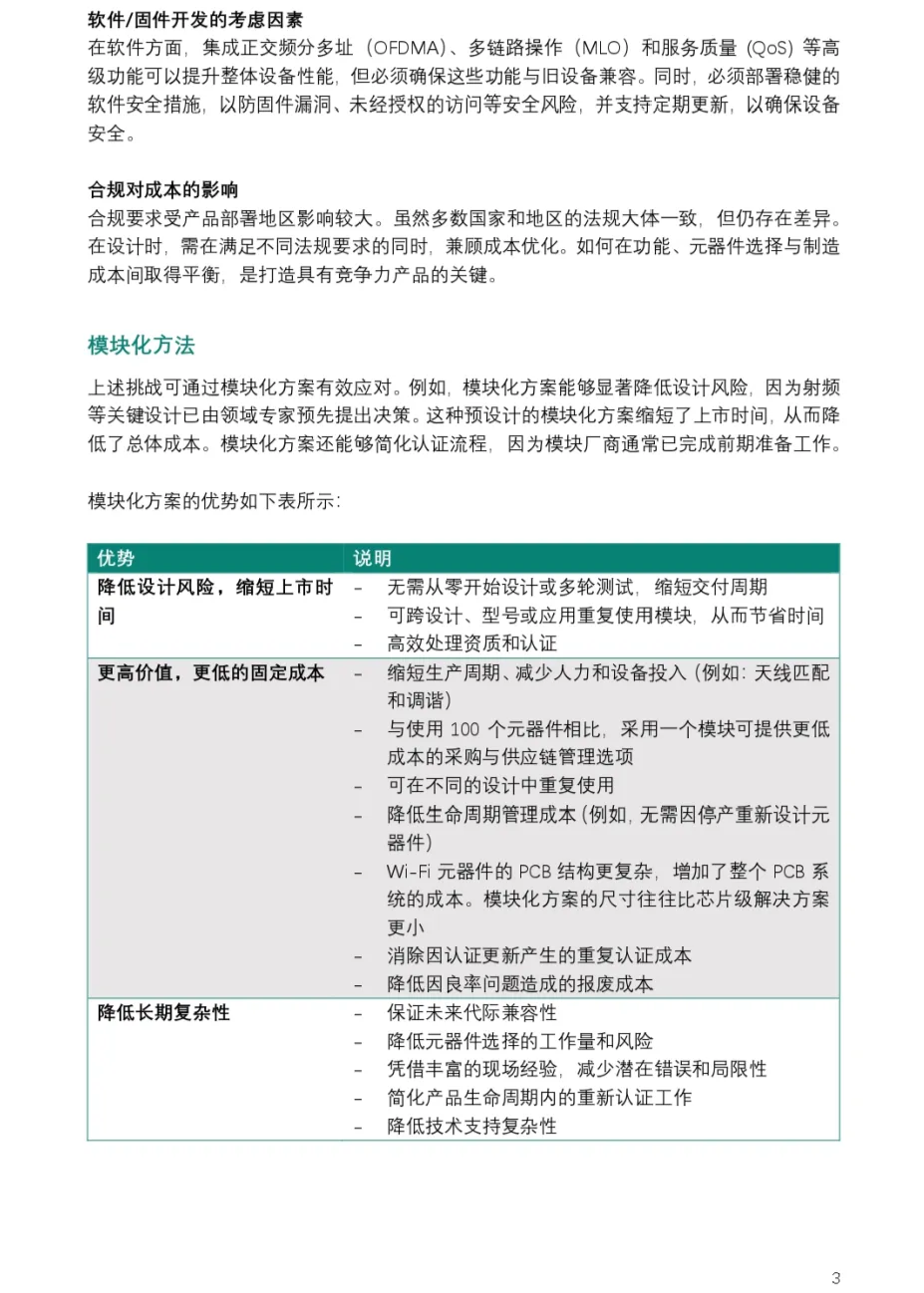但是,設計先進的 Wi-Fi 設備需要克服多重挑戰,包括頻譜效率、頻寬管理、硬體設計、軟體/韌體開發、合規性以及成本優化等。模組化方案可以有效應對這些挑戰。