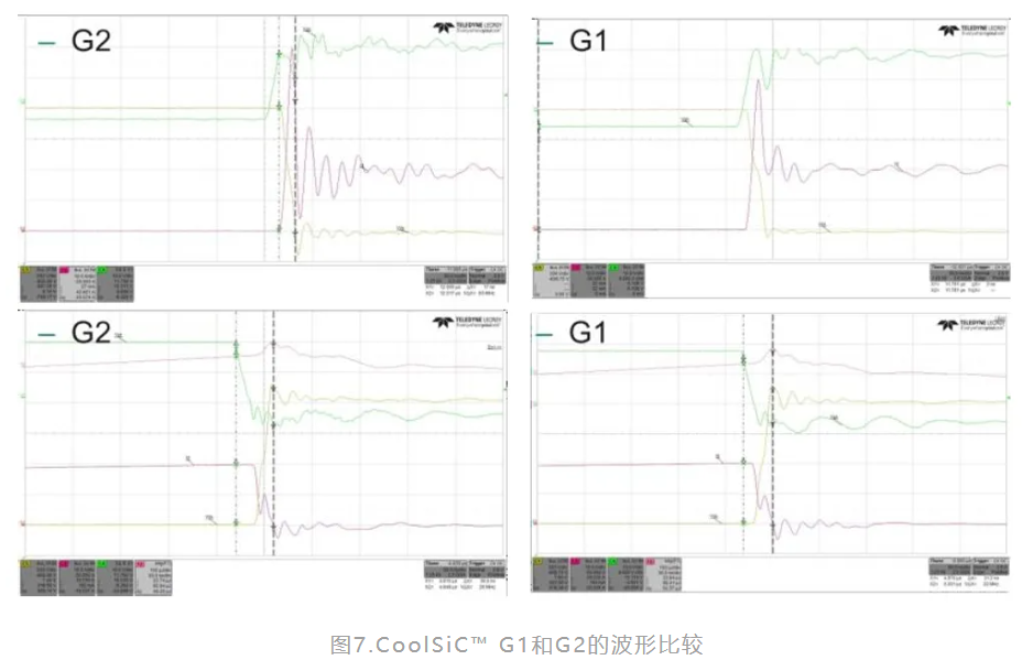 透過比較分析G1和G2元件在相同工作條件下的開關波形,可以發現它們的瞬態行為存在明顯差異。在接通瞬態期間,G2元件比G1元件表現出更明顯的振盪,這可歸因於其更高的di/dt和dv/dt特性。然而,儘管振盪加劇,G2元件的開關行為仍然控制得很好。