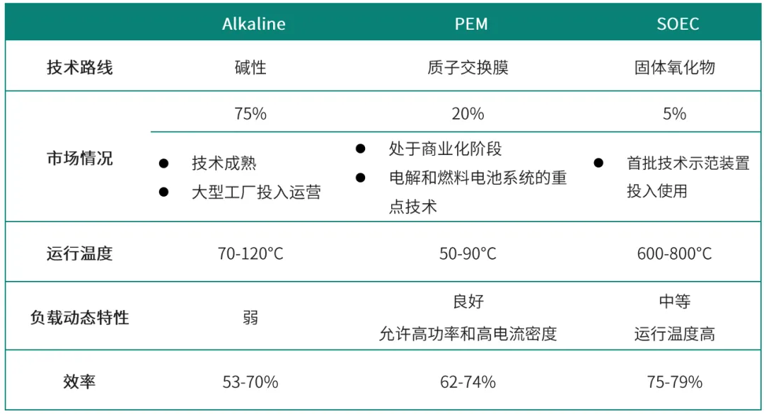電解氫想必很多人都看過,我們中學化學老師會用電解水的例子來講解電化學反應。工業上的電解氫技術需要結合效率、成本以及工藝的成熟度,我們常見的有三種:鹼性電解水製氫(ALK)、質子交換膜製氫(PEM)和固體氧化物電解水製氫(SOEC)。