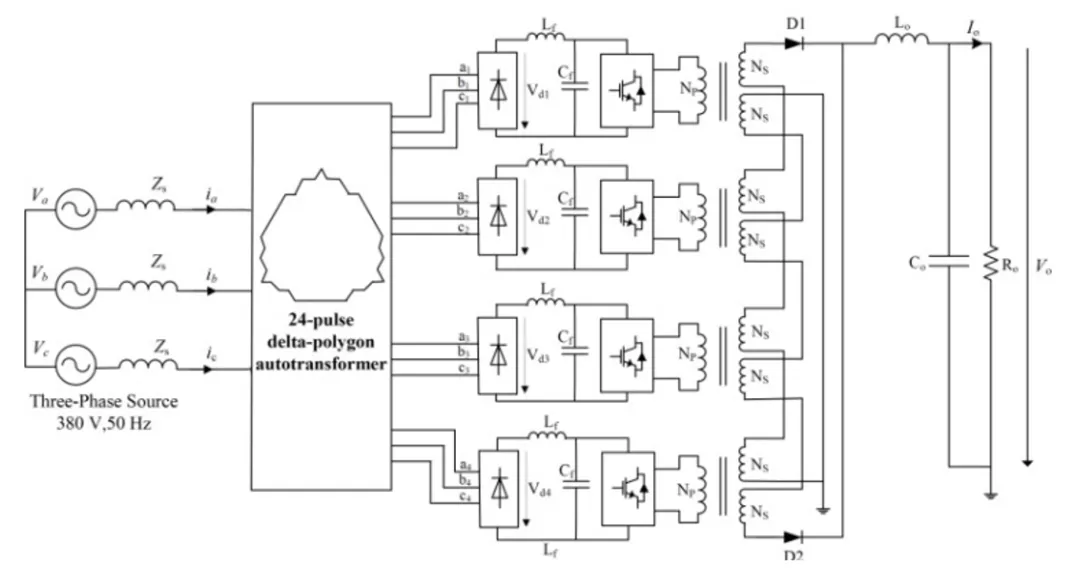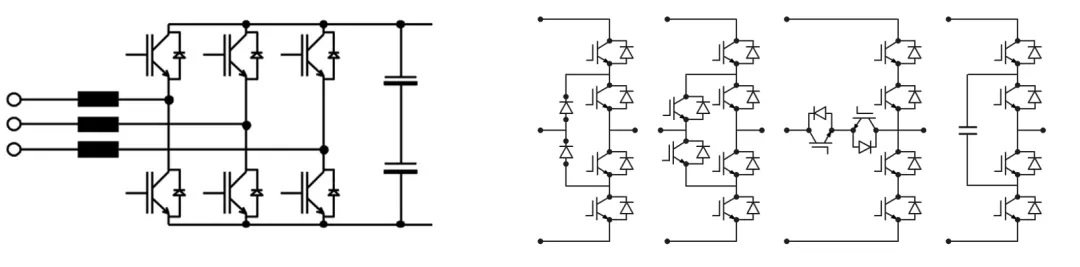 PWM全控整流透過調節IGBT的占空比,可以將輸入端的交流電流控制為正弦波,從而大幅降低電流諧波失真並提升功率因數。也可以使用碳化矽MOSFET取代矽IGBT,從而簡化拓撲。響應速度快,電能品質佳,無需整流變壓器。主要拓撲包括兩電平的B6和三電平。