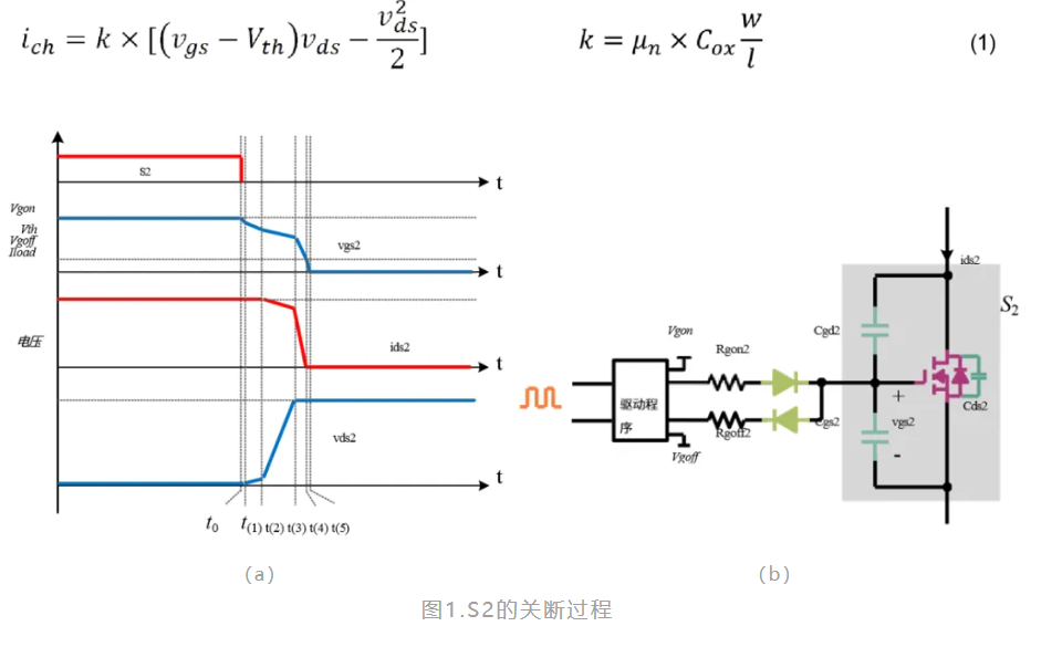 在t1-t2階段,開關工作於線性區。vgs與vds和識別碼有關。這一過程可表示為方程式(1)。這裡的k與元件結構和材料有關。