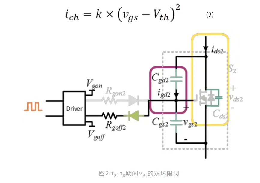在 t2-t3 階段,開關工作在飽和區。vgs與識別碼的關係如式(2)所示。然而,如圖2所示,這一時期的vds受到兩個迴路的限制,一個是柵極驅動器迴路,另一個是功率迴路。更多細節將在論文全文中給出。