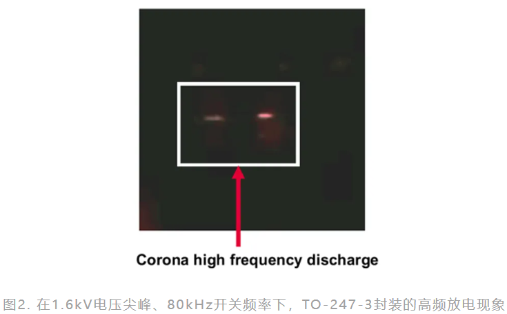 CoolSiC™ 2000V SiC MOSFET 的 TO-247PLUS-4-HCC 封裝被設計為在不影響系統可靠性的情況下提供更高的功率密度,即使在高壓和高頻率的嚴苛條件下也是如此。如圖 1 所示,新封裝具有 5.5mm 的電氣間隙和 14mm 的爬電距離。這可以防止高壓下的高頻放電(見圖 2)。TO-247PLUS-4-HCC 封裝的高度和寬度與其他 TO-247 封裝相同。它與標準 TO-247-4 針腳和 Kelvin 發射極 4 針腳封裝相容,由於低雜散電感的閘極-發射極迴路,可以實現超低開關損耗。