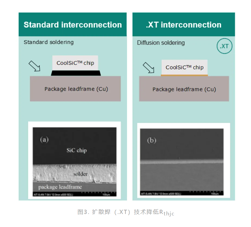 與標準焊接相比,.XT焊接技術可以實現最高25%的結到外殼的熱阻(Rthjc)降低,如圖3所示。CoolSiC™ 2000V SiC溝槽柵MOSFET系列產品的R導通電阻範圍從12到100mΩ,同時配套的二極體產品系列的電流範圍為10到80A。