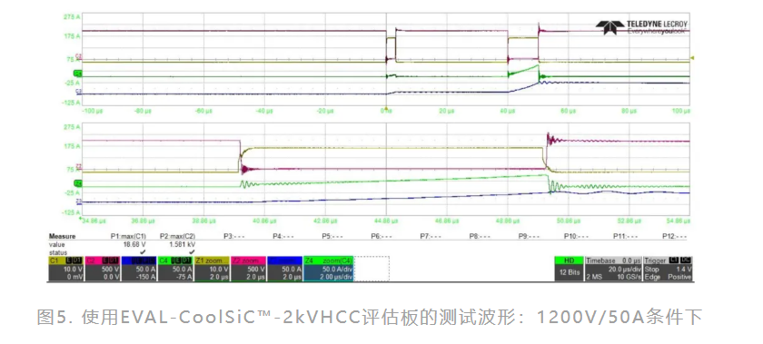 圖5展示了一個幾乎完美的測試閘極波形,沒有過衝或欠衝。圖中看到的振盪是由PCB佈板中的寄生電容引起的,而不是由元件本身引起的。測試條件如下: