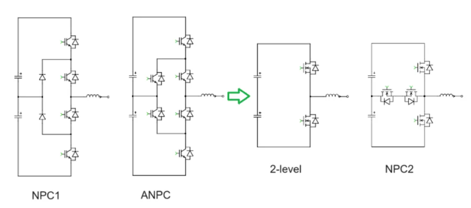 圖6. 使用2000V產品,從NPC1/ANPC拓撲結構到兩電平/NPC2拓撲結構