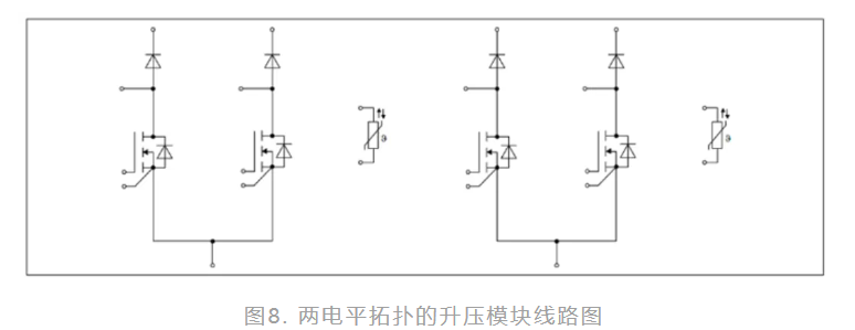 傳統的大功率組串太陽能逆變器的升壓解決方案通常採用飛跨電容或雙升壓拓撲結構。然而,2000V的SiC MOSFET在Easy 3B封裝中使得可以實現更簡單的兩電平拓撲結構,如圖7所示。這減少了功率元件的數量,同時提高了功率密度並降低了整個系統的成本,特別適用於1500 V。直流電應用。DF4-19MR20W3M1HF_B11模組採用Easy 3B封裝,具有4路升壓通道,使用2000V的SiC MOSFET和二極體,採用對稱設計和低雜感結構,如圖8所示。它提供了最低的R。導通電阻 (DS(on))與FIT率、更高的開關頻率以及更高的功率密度。該模組還可以用於2路升壓通道,並聯後的電流每路可達120A。