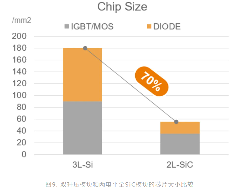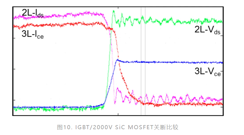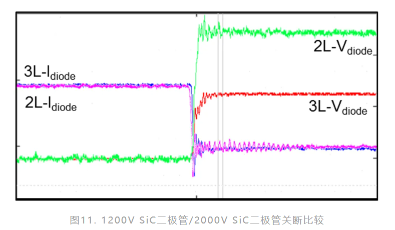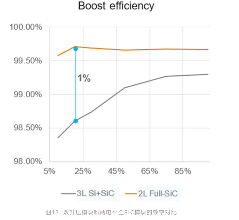 圖9顯示了雙升壓模組與兩電平全SiC模組的晶片尺寸比較。結果表明,兩電平全SiC模組解決方案的晶片尺寸減少了70%。兩電平全SiC模組的功率密度也更高。圖10和圖11展示了1200V IGBT/二極體與2000V SiC MOSFET/SiC二極體的不同關斷波形。唯一的差異是關斷電壓平台,2000V元件的電壓平台更高。這可以簡化整個系統並提升其功率密度。圖12顯示了在不同負載條件下的升壓效率曲線。在輕載條件下,兩電平全SiC解決方案的效率提升了1%,在所有工作條件下平均提升了約0.5%。