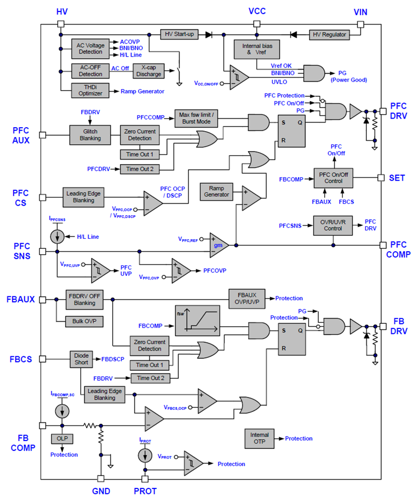 PFC 級工作在零電流切換 (ZCS) 模式,需要輔助繞組。透過 PFCAUX 引腳檢測零電流訊號。此外,晶片還具備智慧 PFC 啟動機制,可改善 PFC 級的瞬態反應。反激式級採用準諧振 (QR) 工作模式,以達到高效率,輸出電壓由 FBAUX 引腳監控。輸出電流主要由來自 FBCS 和 FBAUX 引腳的訊號計算。