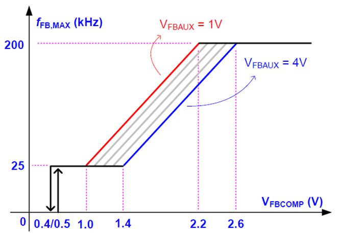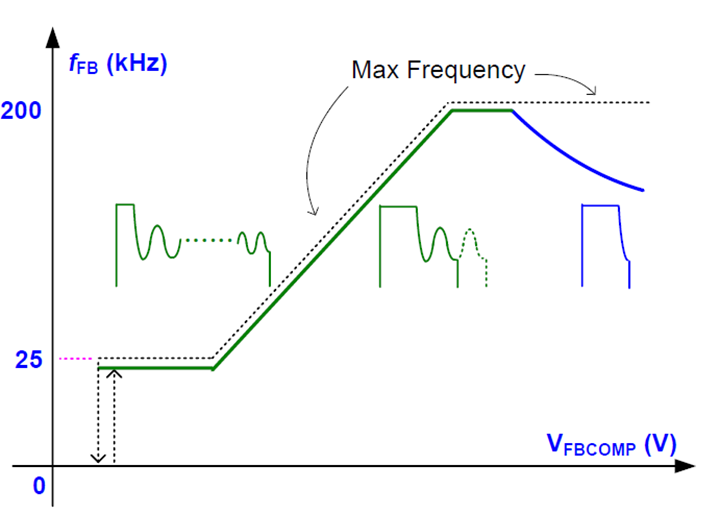 LD7797變換器採用QR工作模式以實現低壓開關,為了避免開關噪聲,在FBDRV下降沿後設定了空白時間(TOFF,FB,MIN),透過對VFBCOMP進行頻率限制,可以降低開關損耗。此外,頻率限制也與VFBAUX相關,而VFBAUX與輸出電壓VOUT有關。因此,不同的輸出電壓對應不同的開關頻率特性。如下圖所示為頻率限制曲線圖與QR工作模式特性曲線。