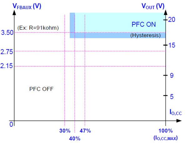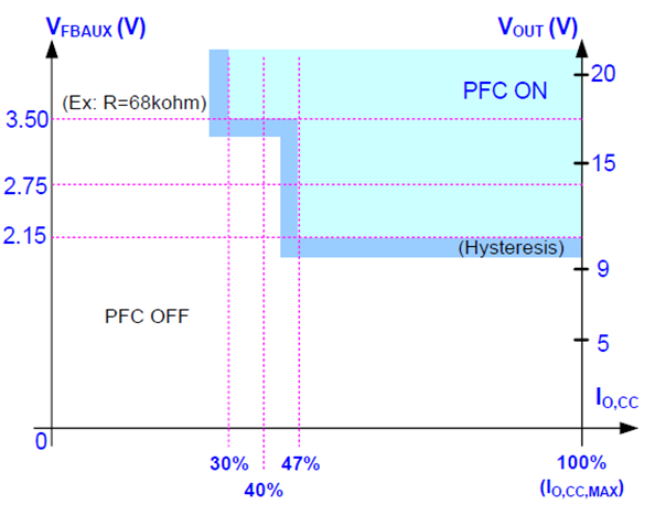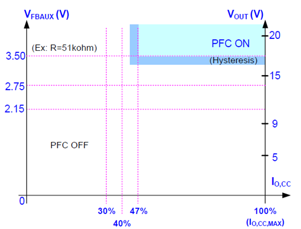 透過在SET引腳上連接不同阻值的電阻,可以設定不同的預設值。PFC的開關特性如下所示。