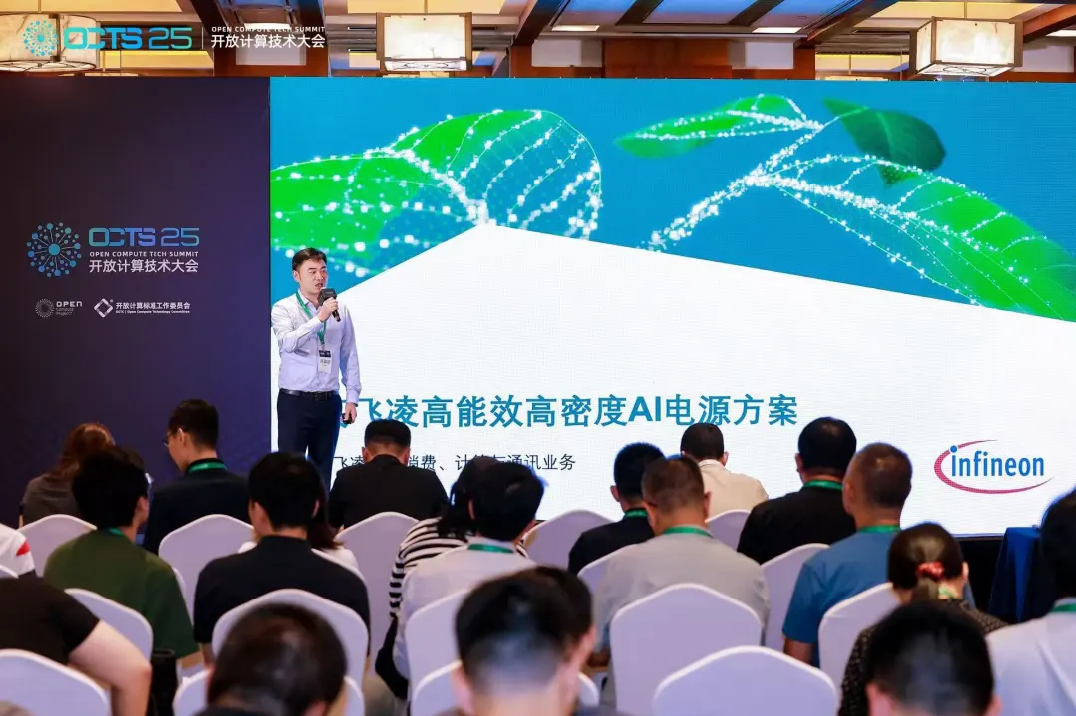 英飛凌科技消費、計算與通訊業務大中華區高級市場經理周成軍在大會開放系統論壇上以「英飛凌高效能高密度AI電源方案」為題發表演講。