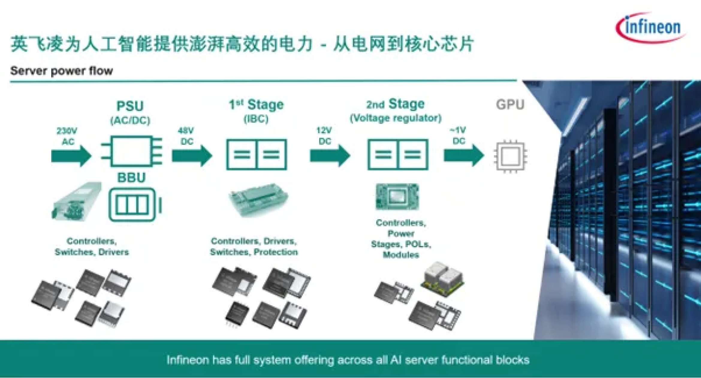 英飛凌的創新半導體技術有助於提升AI伺服器和資料中心系統的永續性與可靠性,不斷推動低碳化與數位化進程。