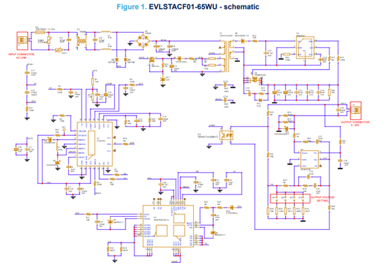 在初級端,STACF01 控制器與 MasterGaN1L 搭配使用。MasterGaN1L 是一款整合了高壓驅動器的600 V半橋增強型氮化鎵(GaN)HEMT。STACF01 內建升降壓轉換器,透過單個變壓器的輔助繞組實現極低的待機功耗。