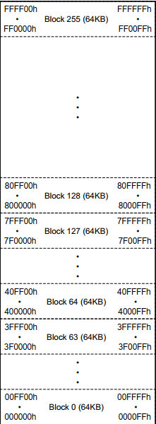 以W25Q128為例,存儲空間劃分為256塊(Block)、4096扇區(Sector)、65536頁(Page),擦除的最小單位為扇區(4KB)。