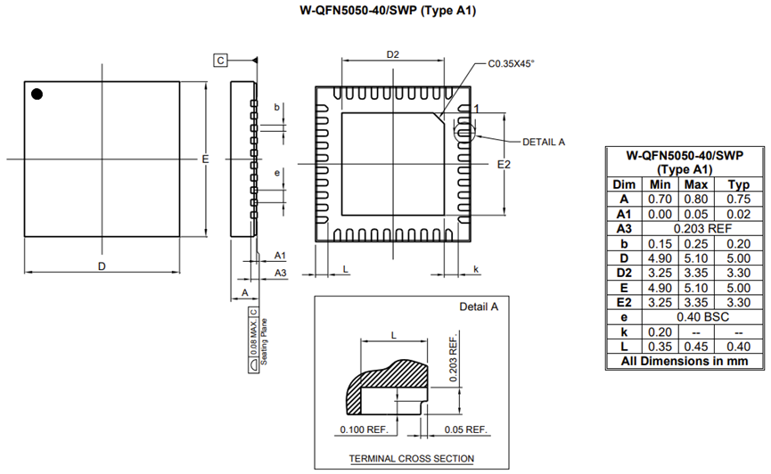此元件供應為濕潤性 W-QFN5050-40/SWP (Type A1) 封裝。