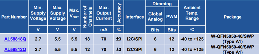 AL58818Q/12Q 具有內建可定址暫存器,並提供三個可程式化的bank (A、B、C),可針對每個顏色進行軟體控制,使使用者能輕鬆自訂器件以符合需求。當所有 LED 關閉超過 30ms 時,AL58818Q/12Q 會自動進入其省電模式,最大僅消耗 15µA。