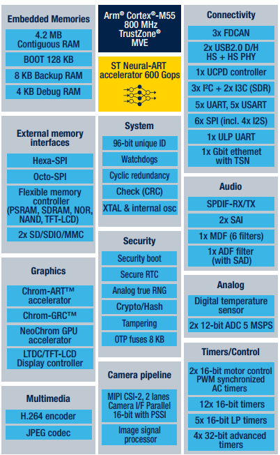 - 4.2MB 嵌入式 RAM:支持無閃存配置,提供高速外部存儲接口(如 OCTOSPI),滿足高內存需求應用。