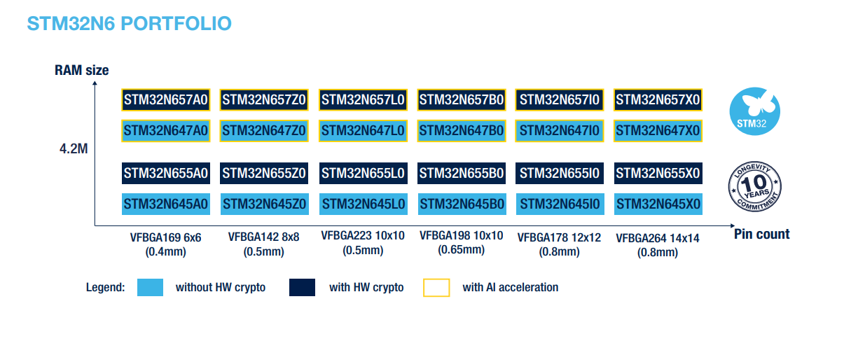 - AI 系列(STM32N6x7):集成 NPU,專為 AI/ML 任務優化。