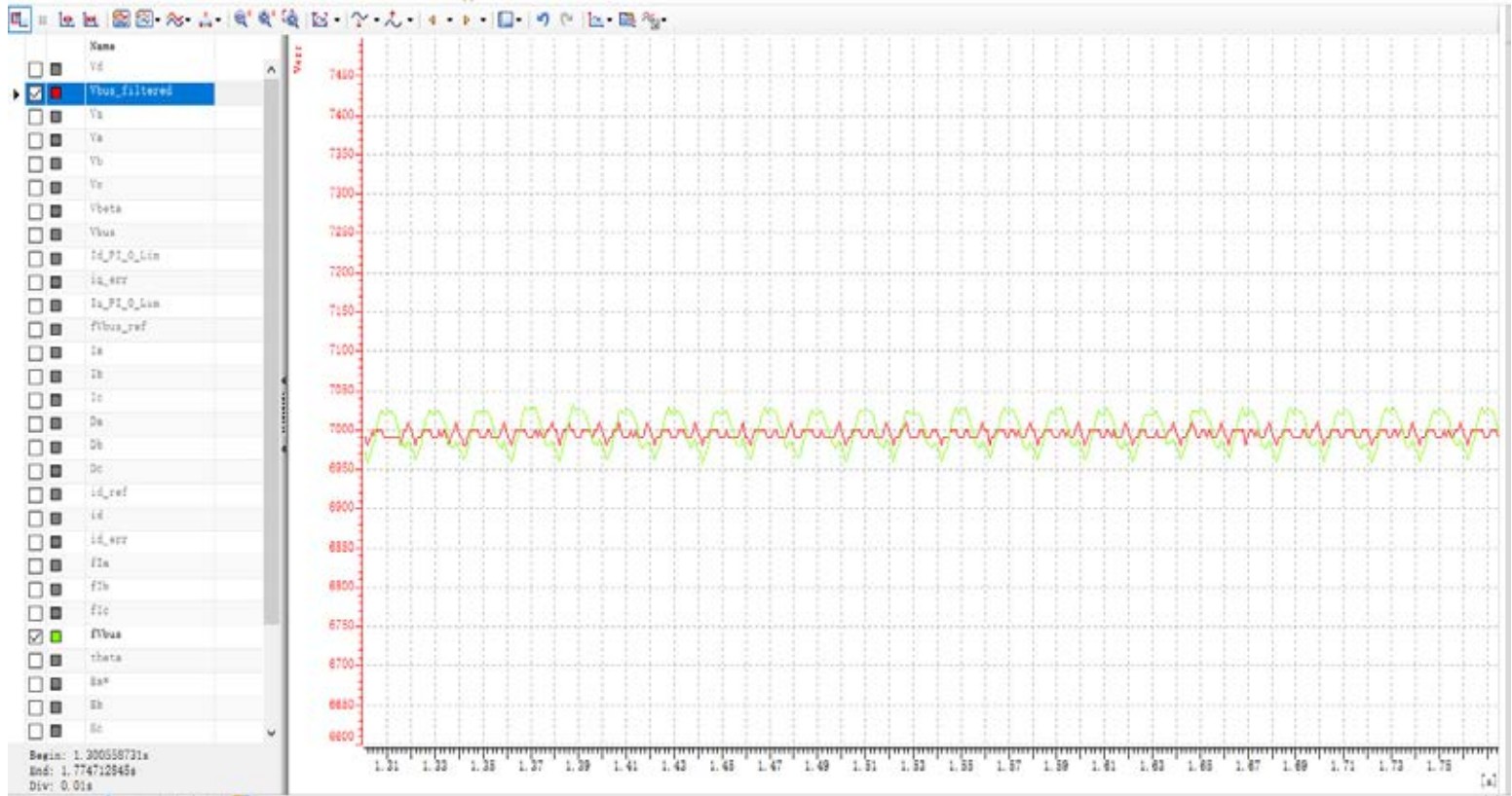 實際電路是存在著50Hz 波動,如圖「實測BUS電壓與濾波後BUS電壓」所示,紅色曲線為濾波後的BUS電壓。