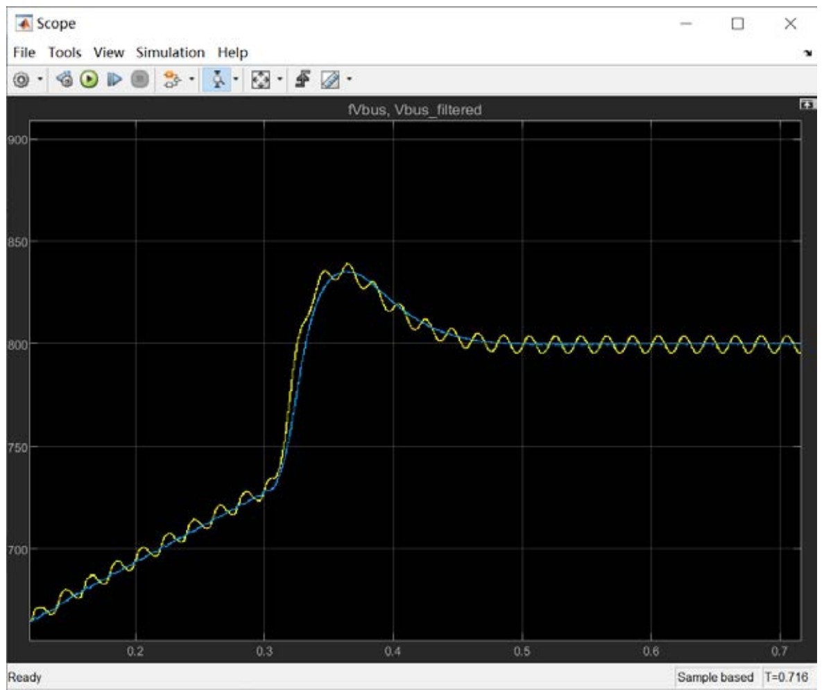 總結,如圖「帶陷波濾波器的BUS電壓模擬」所示,黃色曲線為模擬不穩定狀態的BUS電壓,藍色曲線為濾波後的BUS電壓。
