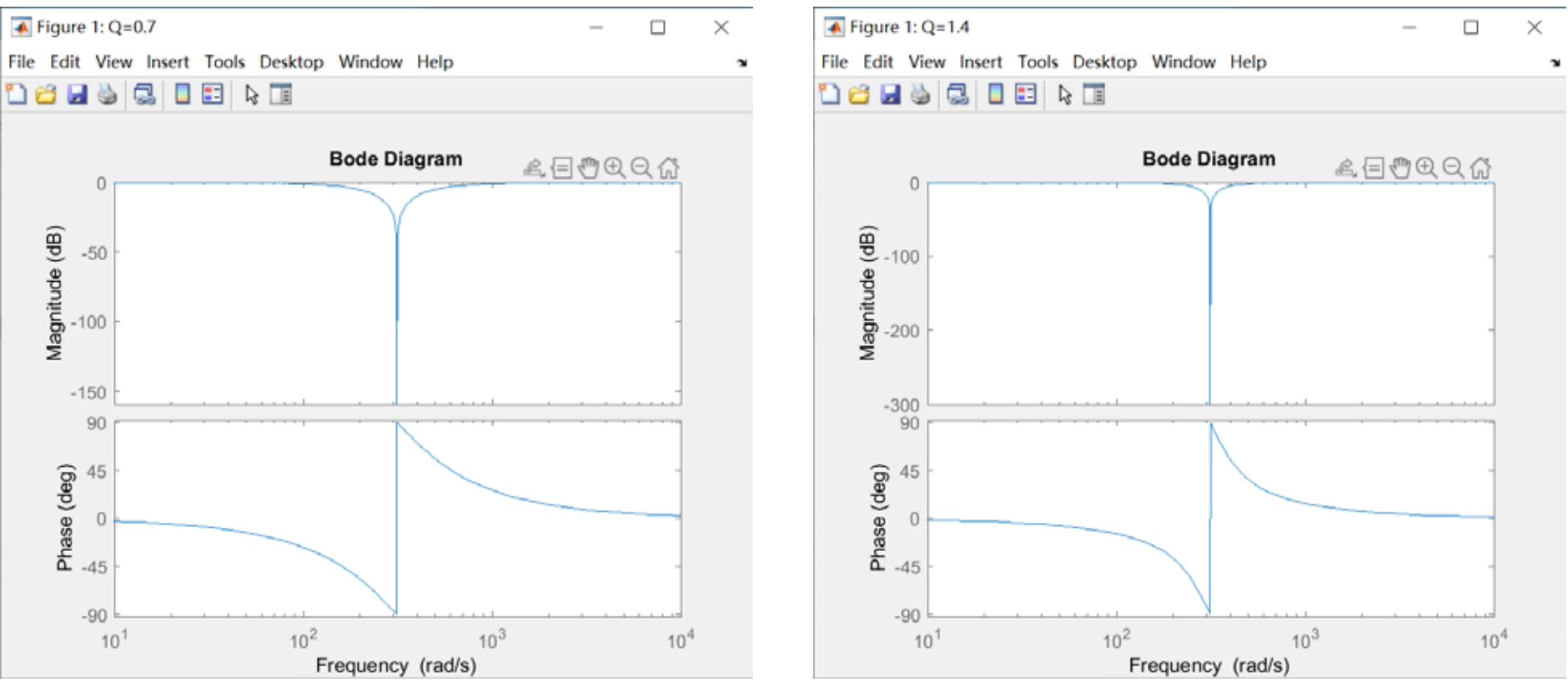 下兩圖為𝑄 = 0.7 和𝑄 = 1.4 的波德圖, 可看出其衰減強度的差異。