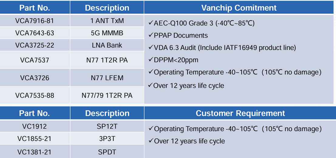 所有 VCA 晶片均通過嚴格的第三方 AEC-Q100 認證測試,並在通過 IATF16949 認證的生產線上進行封測。VANCHIP 承諾提供寬溫域(-40℃~85℃)、超長生命周期(≥12年)以及 PPAP 文件支持,以滿足車規級的嚴苛要求。VANCHIP 正在準備推出更寬溫域(-40℃~105℃)的產品。具體來說,車規級射頻功放具有以下特點: