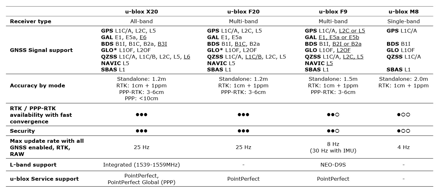 u-blox X20 是一款高精度的全頻段 GNSS 平台,支持 L1、L2、L5 和 L6/E6 頻段,能夠提供全球厘米級的定位精度。該平台集成了 L 頻段接收器,用於 GNSS 校正服務,並支持 RTK 和 PPP 校正服務,以提高遠程區域的精度。