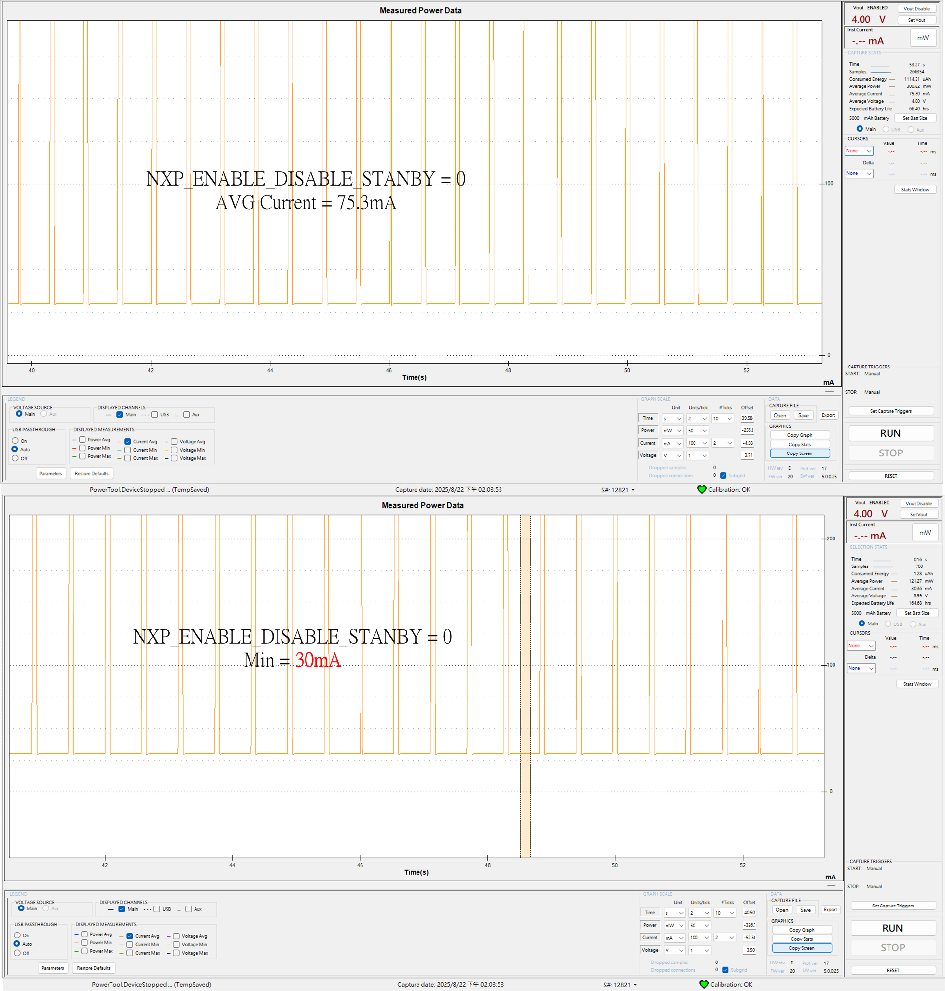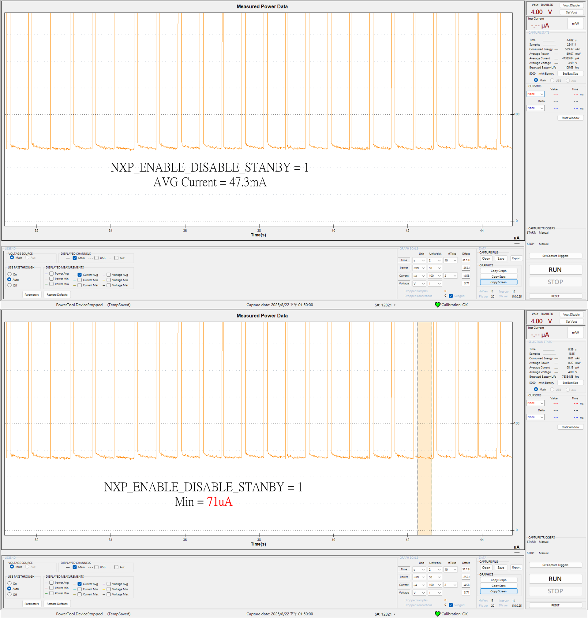 客戶確認修改NXP_ENABLE_DISABLE_STANBY後,對於耗電狀況是有幫助的(30mA → 71uA):