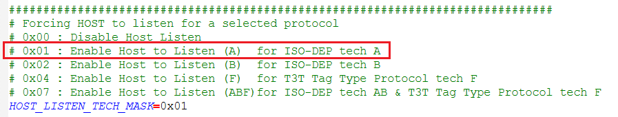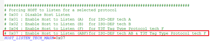 另外在客戶提供的libnfc-nci.conf裡,HOST_LISTEN_TECH_MASK的設定值是0x7,這部分與PN7220支援並不符合。