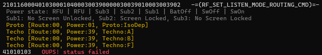 重新檢視device開機log, 發現在設置RF_SET_LISTEN_MODE_ROUTING_CMD階段的RSP是有問題的: