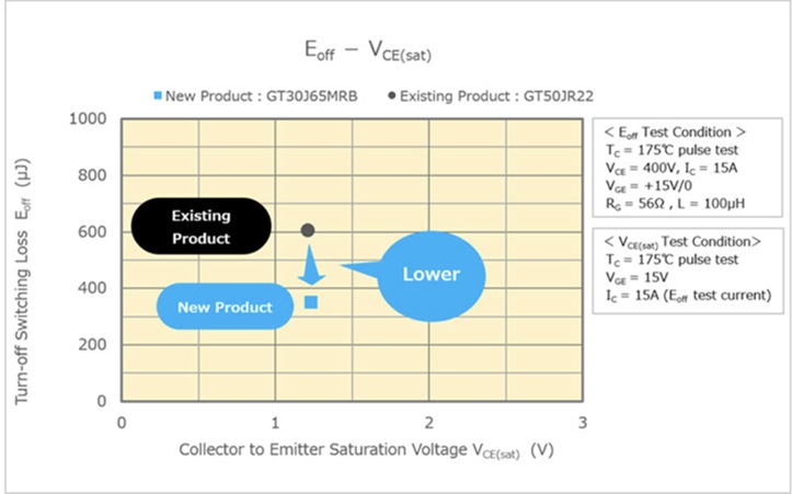 由於引入了最新工藝,利用優化的溝槽結構確保了0.35 mJ(典型值)的低開關損耗(關斷損耗),與東芝當前產品GT50JR22相比,GT30J65MRB的開關損耗降低了大約42%。此外,新款IGBT還包含一個內置二極體,其正向電壓為1.2 V(典型值),比GT50JR22降低了大約43%。這些改進有助於提高設備效率。