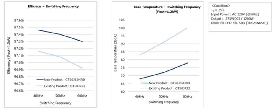 另外,由於GT30J65MRB的工作頻率更高,可以實現更高的效率,因此器件殼溫也有大幅下降。隨著功率器件效率的提高,減少其發熱量,可以使能量損失的降低。