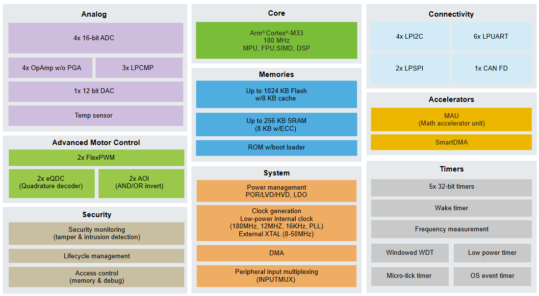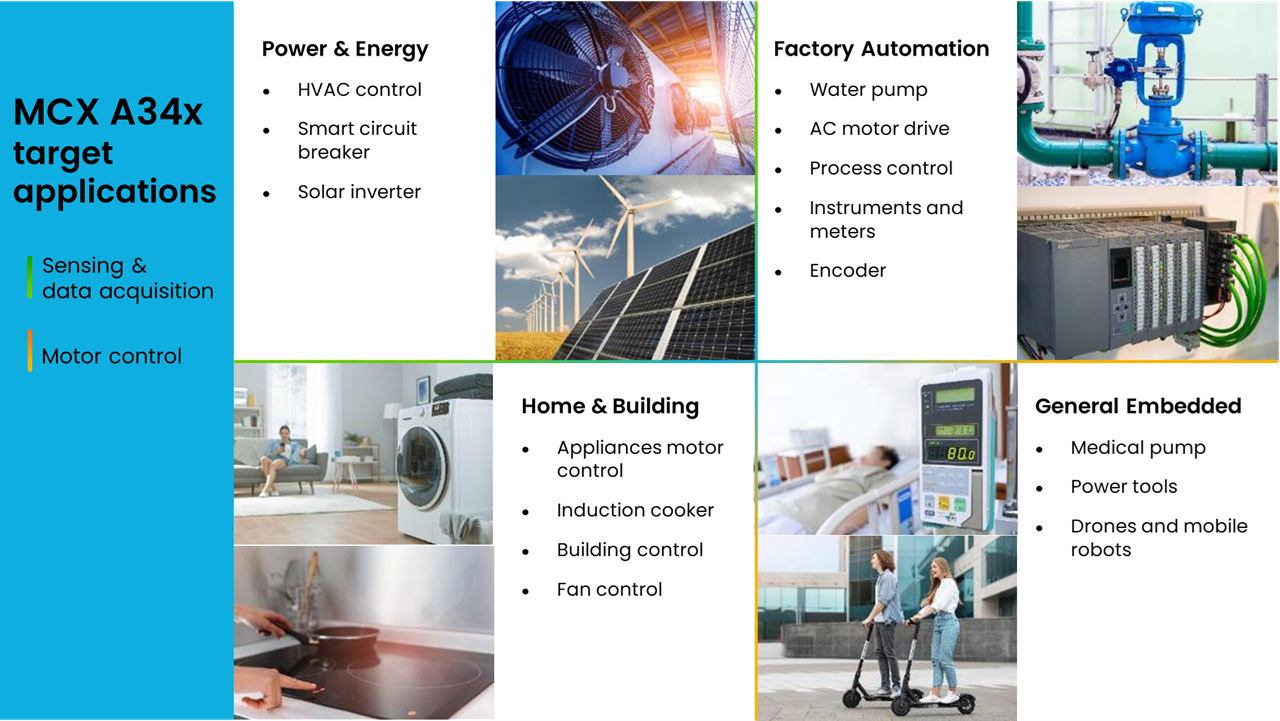 世平集團代理的 NXP 恩智浦半導體,已於 2025 年 8 月底繼 MCX A1xx 系列後推出 MCX A34x 系列的產品。此 MCX A34x 產品集成Cortex-M33,主頻速度為 180MHz,並且內部集成 1MB Flash 及 256KB SRAM,並且同時集成 Smart DMA 及 MAU (Math Accelerate Unit) 核心;MCX A34x 系列產品在外設介面除了提供多組 LPUART、LPSPI、LPI2C、CANFD、GPIO 以外,也提供多組 ADC、OPAMP、LPCMP 等外設的介面給客戶設計使用; 而 MCX A34x 在工作溫度可以支持 -40~125度溫度規格,以讓 MCX A34x 系列 MCU 產品可以廣泛運用到工業領域市場。