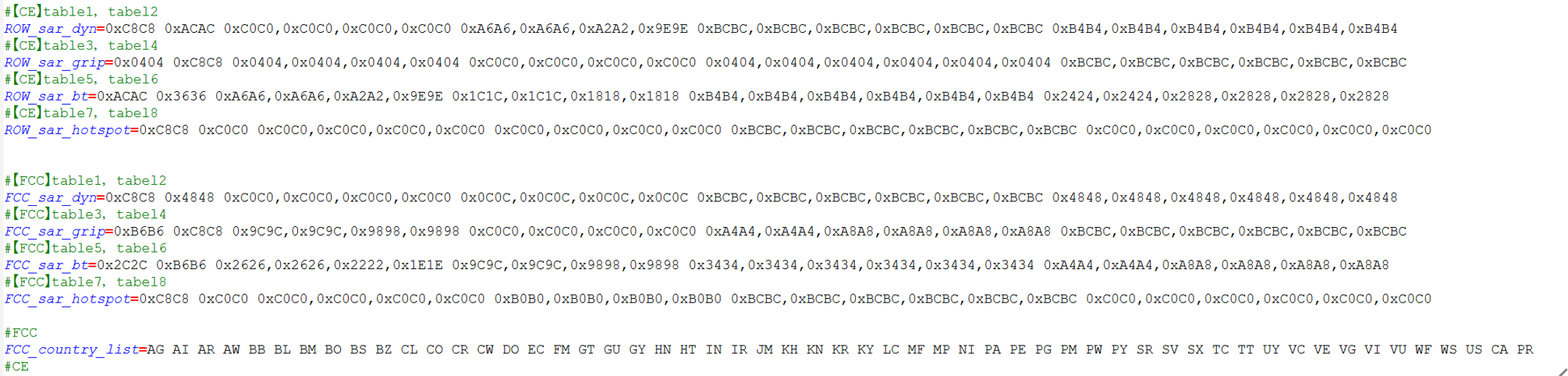 FCC_sar_dyn=0x00C8 0x00BE 0x00B2,0x00B2,0x00AC,0x00AE0x00A8,0x00A8,0x00A2,0x00A40xBCBC,0xBCBC,0xBCBC,0xBCBC,0xBCBC,0xBCBC 0xB4B4,0xB4B4,0xB4B4,0xB4B4,0xB4B4,0xB4B4
