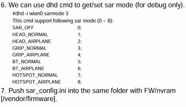 在sar_config.ini讀取後,執行dhd sarmode 3不報錯即可。