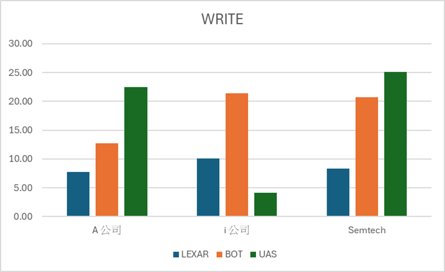 在寫入速度的測試中, A公司、i公司與Semtech在使用LEXAR USB 2.0存儲設備時的表現差異不大. 然而, A公司在BOT傳輸協定的寫入速度上顯示出明顯的落後, 而i公司則在UAS傳輸協定的寫入速度上表現不佳. 相比之下, Semtech在所有測試項目中均展現了更佳的性能, 突顯其技術的穩定性與高效性.