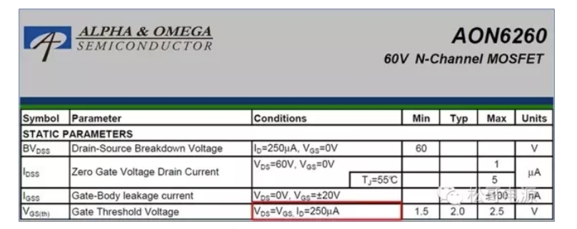 功率MOSFET管的閾值電壓VGS(th),在數據表中定義的測量條件為:VDS=VGS,ID=250uA,對應測試電路如圖1所示。