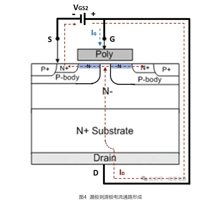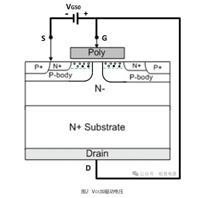 功率MOSFET管的柵極與源極之間加上正向驅動電壓VGS,在柵極表面形成正電場,柵極氧化層下面P區的電子就被吸引到P區的上表面;VGS電壓增加,P區內部更多電子被吸引到P區的上表面;正常條件下,P區多子是空穴,少子是自由電子,源極(外加電源負端)的自由電子無法從N型源極通過柵極氧化層下面P區流向N型漏極(外加電源正端),也就是電流無法從漏極通過柵極氧化層下面P區流向源極,如圖2所示。