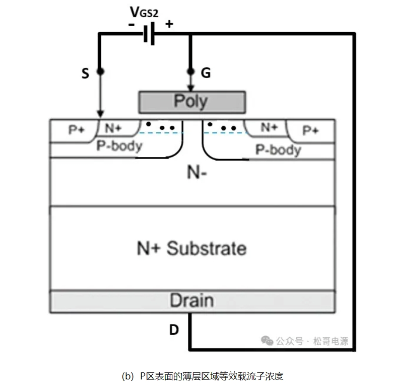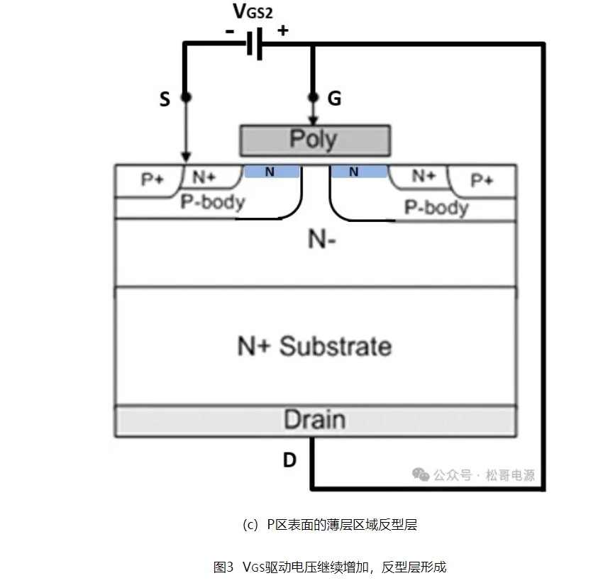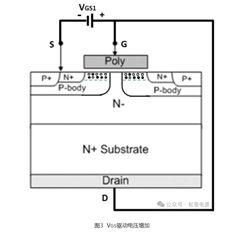 VGS電壓繼續增加,柵極氧化層下面P區表面的薄層區域,自由電子的濃度繼續增加,自由電子的濃度增加到等於於空穴的濃度,如圖3所示。