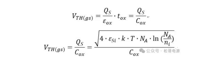 其中,QS為溝道耗盡區電荷,Cox為單位面積柵極氧化層電容,Cox與柵極氧化層厚度成反比;eSi為矽材料的介電常數,k為玻耳茲曼常數,T為溫度,NA為P型參雜濃度(受主參雜濃度),ni 為本徵載流子濃度。