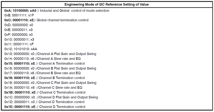 這些值控制各通道(A/B/C/D)的終端阻抗與共模輸出條件。