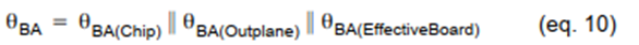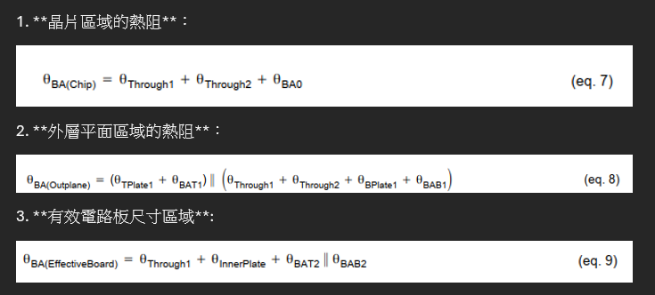 最後,根據公式10結合封裝與電路板的貢獻,可以計算出整個系統的總熱阻。當功率耗散已知時,使用者即可估算晶片的溫升。