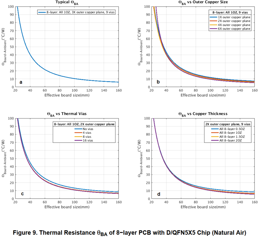 與尺寸,以及銅箔平面的大小。使用者可以根據其電路板的特性與有效尺寸,參考最接近的曲線來估算其值,特別是在專案中使用5 × 5 Q/DFN元件時。