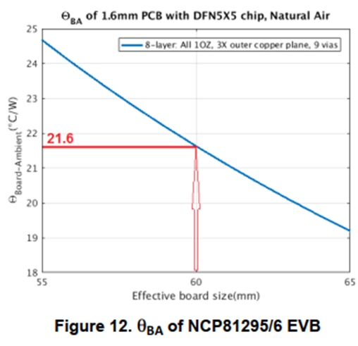 經佈局評估後,NCP81295/6 EVB 的有效尺寸為 60 mm,外層銅箔面積約為晶片面積的 3 倍(標準化外層銅箔面積因子為 3)。根據圖 8.a 的條件,NCP81295/6 EVB 的熱阻數據可從圖 8.a 中獲得。