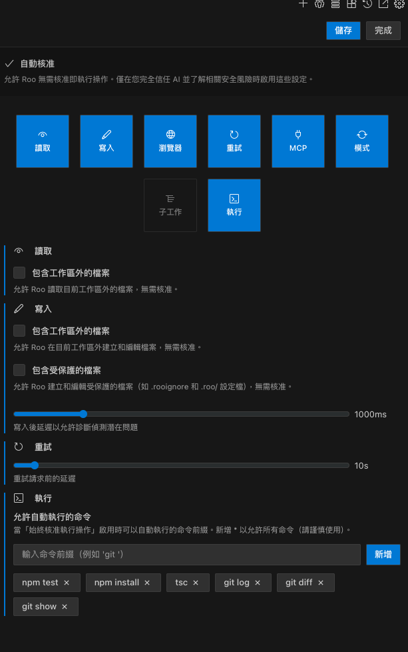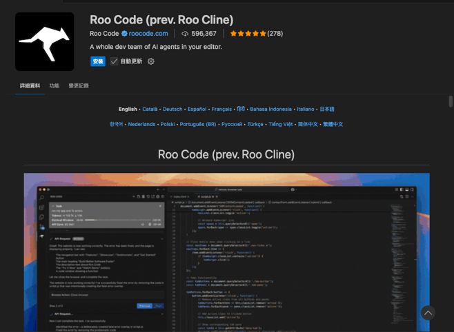 - MCP 協議擴展:支援「模型上下文協議(MCP)」,這使得 Roo Code 能像安裝外掛一樣,連接外部資料庫或工具。