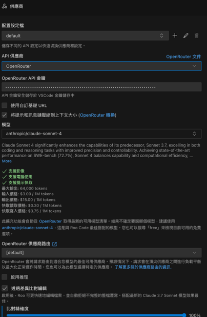 - 模型策略你可以為不同模式設定不同的模型。例如,讓「架構師」使用邏輯性強的 Claude 3.5 Sonnet,而日常 Coding 則使用成本較低的模型。