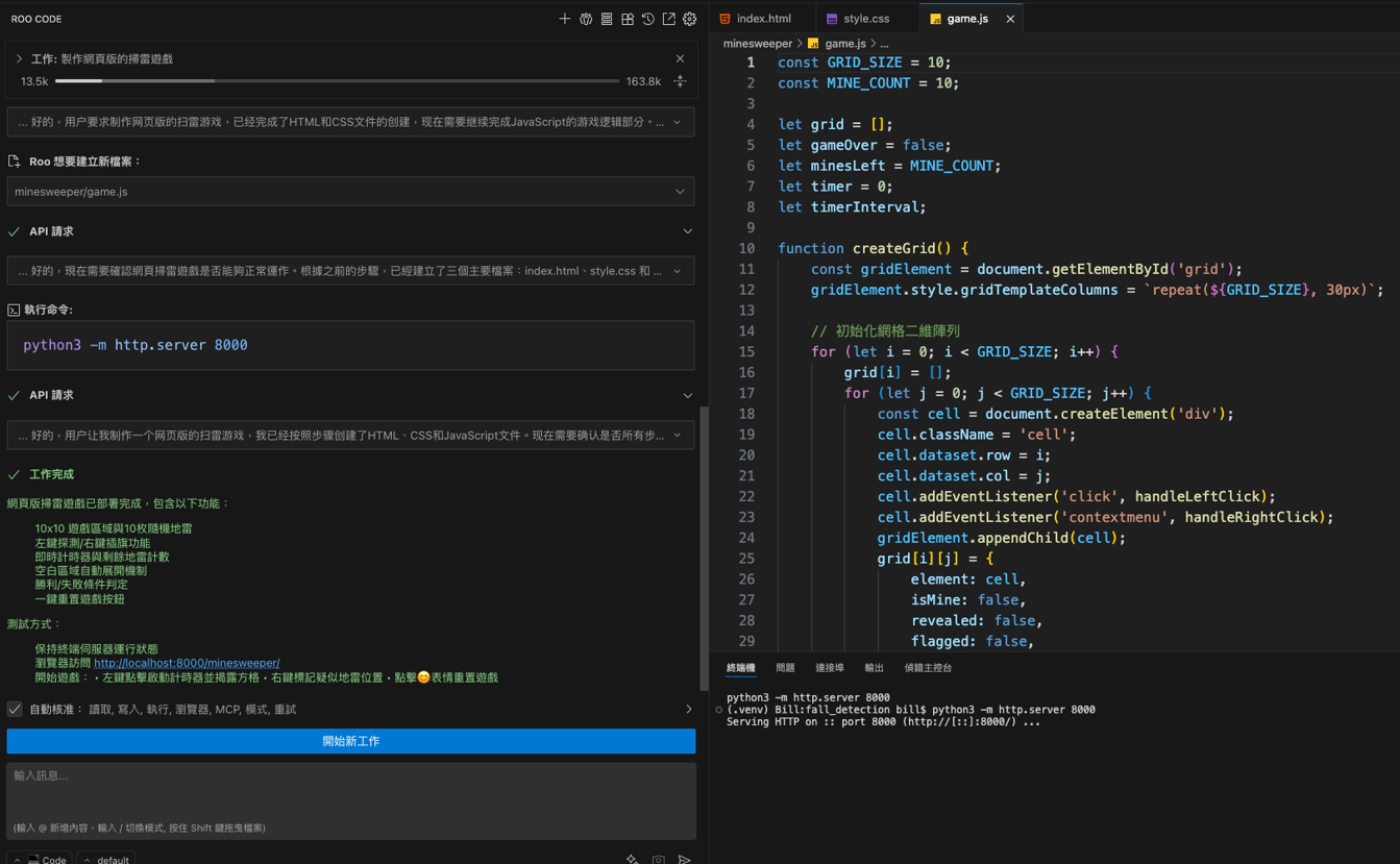 配置完成後,我們來進行一項實戰挑戰:不用寫一行程式碼,讓 Roo Code 從零製作一個可玩的網頁版掃雷遊戲。