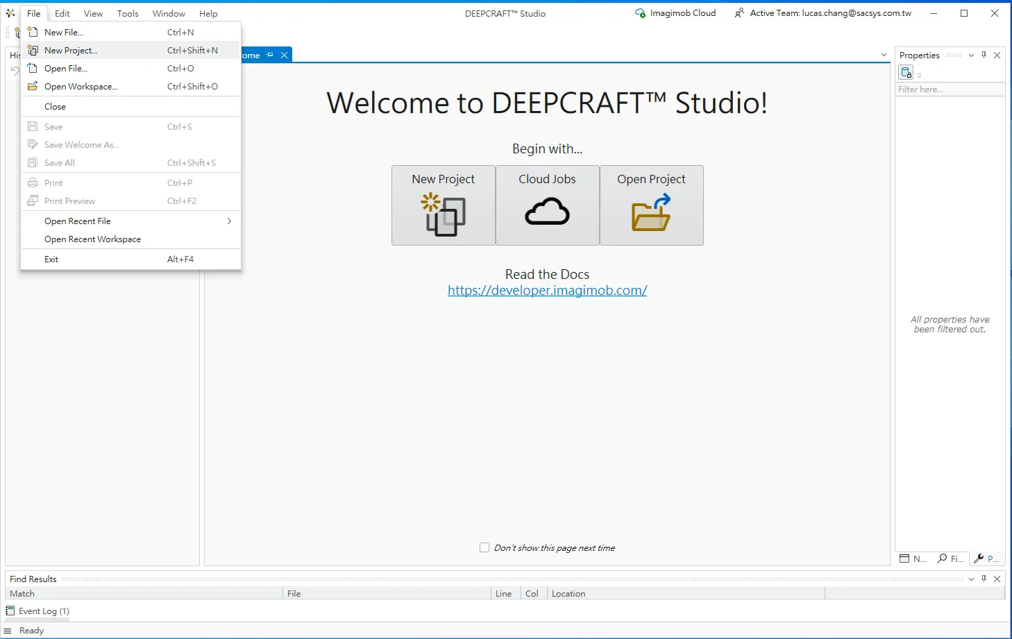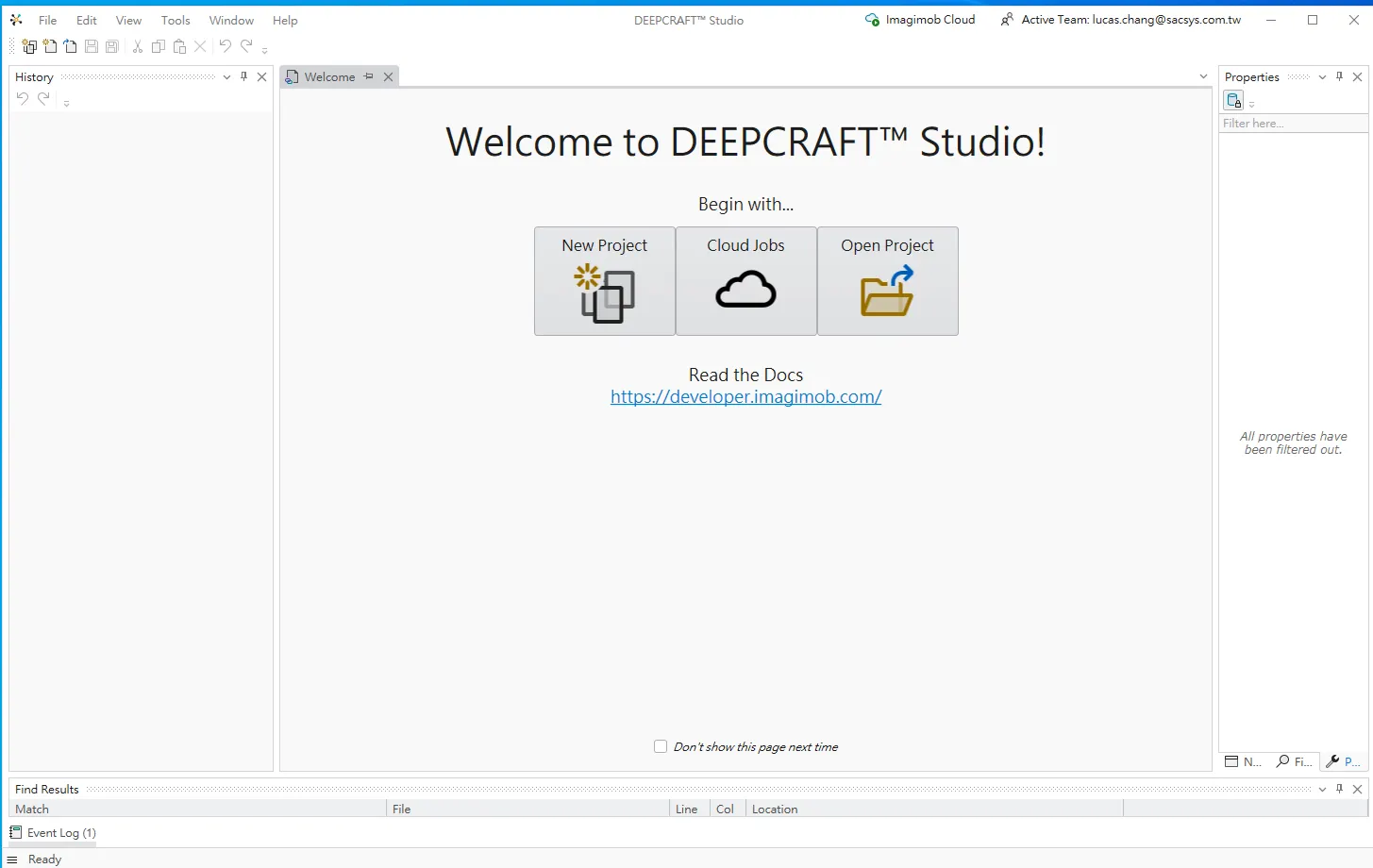 啟動 DEEPCRAFT™ Studio 後的主視窗。中央的歡迎頁面提供三個快速入口:新專案(建立新專案)雲端工作雲端訓練工作打開專案(打開已有專案),並附上開發者文件連結,左右兩側則是專案歷史與屬性視窗區。