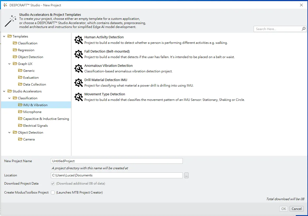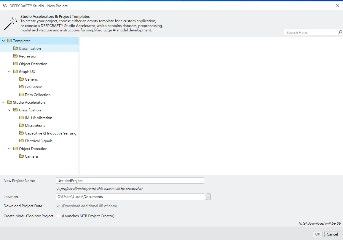 新專案向導介面。左側可以看到 Templates(普通專案模板)與 Studio Accelerators(加速器專案)等分類,包含 Classification(分類)、Regression(回歸)、Object Detection(目標檢測)、Graph UX(圖形使用者體驗)等不同應用方向。下方可以設定 New Project Name(專案名稱)、Location(儲存路徑),並可選擇是否同時建立 ModusToolbox Project,以便後續匯出到 MCU 專案中。